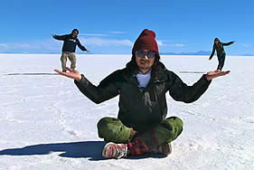 どこまでも続く真っ白な塩湖で、遠近法を利用して不思議トリック写真を撮りましょう!