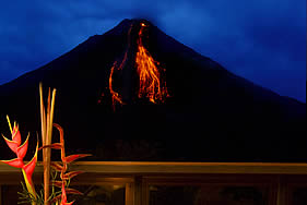 アレナル火山と闇夜に輝く溶岩の噴出し