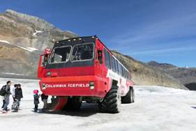 アイスフィールド | アイスフィールド観光 レイクルイーズからコロンビアアイスフィールドまで続く氷河観光道路をドライブ観光します。車窓に延々と続くロッキーの粗削りな山並みの景観をお楽しみください。途中数か所で写真を撮るために停車します。 アサバスカ氷河では観光雪上車に搭乗し、氷河の上に降り立ちます。 バンフでは、カナダの思い出がいっぱい詰まったお土産が見つかるといいですね。 |
