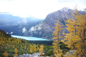 ラーチバレー | トレッキング(1) 専用車で登山口まで移動 まず、モレーン・レイク展望台へと空荷で上がり、神秘的な色合いの湖を眺めます。 そして、トレッキングのスタート。 樹林の中のジクザグルートを登って行くと、カラマツ林に到達します。黄金色したカラマツのトンネルをくぐっていき、ふと振り返ると、テンピークスと呼ばれる山並みが目の前に一気に広がります。 背の低いカラマツの間のルートでさらに標高を上げると、ミネスティマレイク。 天候とルート状態が良ければさらに上のセンチネルパスへと登って行きます。この景色の雄大さは他所ではなかなか目にすることが出来ないかもしれないというほどの景観です。 |