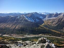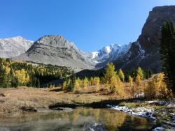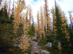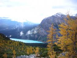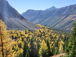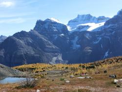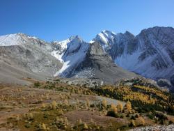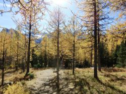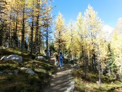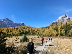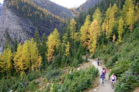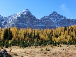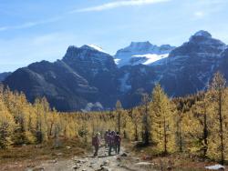 レイクルイーズ | 終日 | トレッキング①ラーチ・バレー 黄金色に染まったカラマツ林の中をくぐり抜けていきます。 森林限界を越えて振り返ると、3000m超の頂を10個見渡せるテンピークス。 |