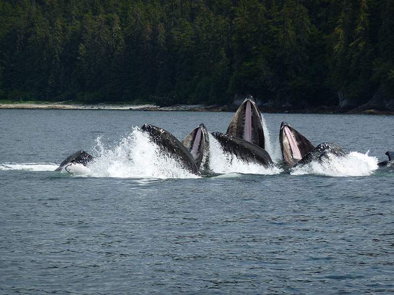 東南アラスカのザトウクジラが見せる独特の漁の方法「バブルネットフィーディング」を見ることができます。また、ブリーチングと呼ばれる大きなジャンプ、胸鰭で水面を打つペック・スラップ、尾鰭で打つテール・スラップ、水中から頭を出し水上の状況を確認するスパイホップなど、ザトウクジラの様々な行動や生態を間近で観察できます。